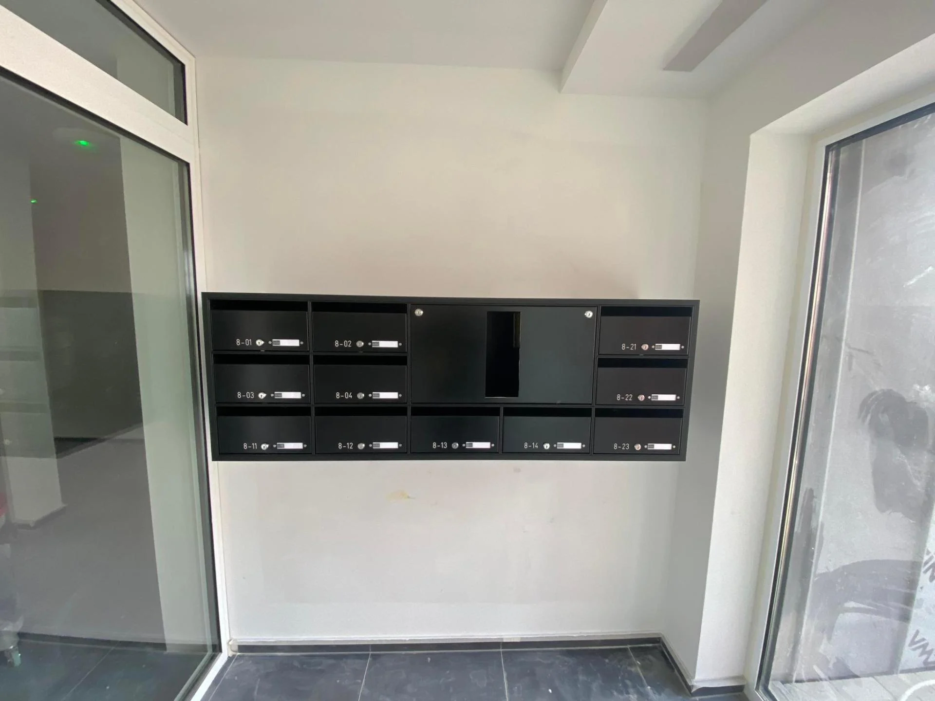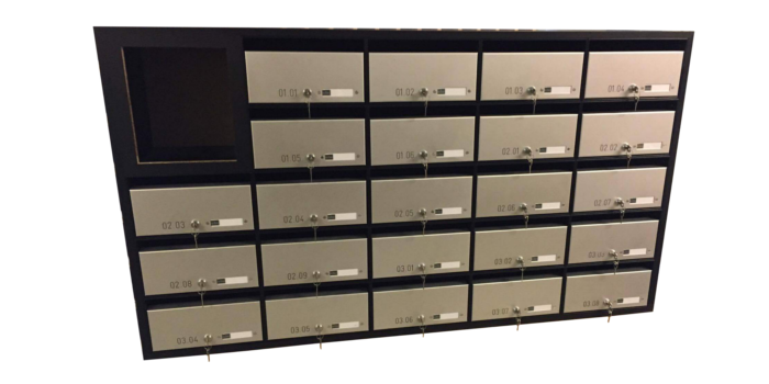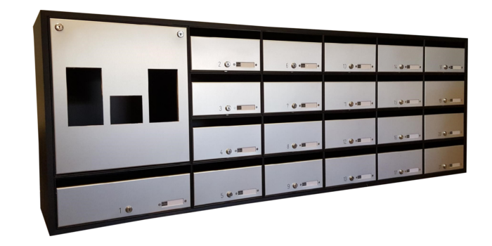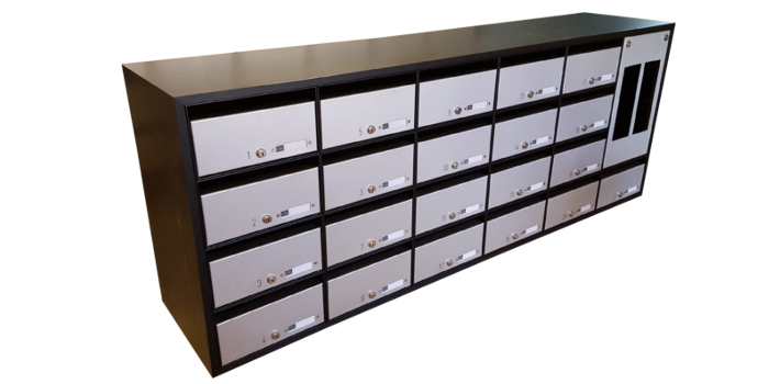Notre ligne OPALE est composée de modules pour l'intérieur type "simple face" (mise et reprise du courrier sur la face avant) avec un corps en acier électro-zingué ép. 8/10 mm et d'une porte en tôle d'aluminium ép. 15/10 mm. Munie d'une serrure à 2 clés ainsi que d'un porte-étiquette clipsé et amovible. Une fente pour l'introduction du courrier protégée par un antivol (espace vide au dessus de la porte).